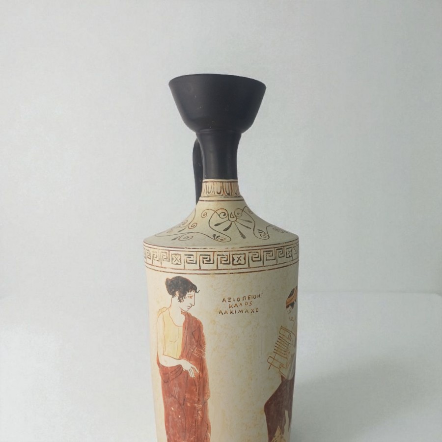 This white-ground lekythos is inspired by the original masterpiece of the renowned Achilles Painter, one of the finest vase painters of classical Athens.