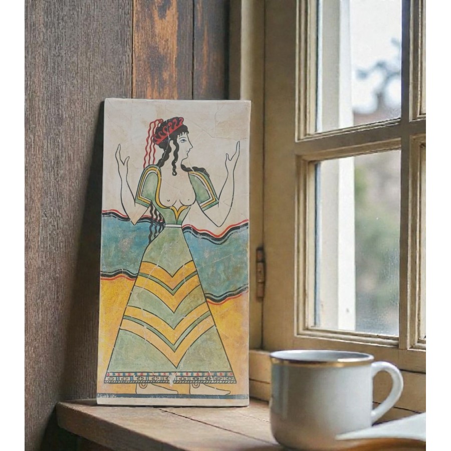 A handcrafted replica of a Minoan fresco depicting the iconic female figure with raised arms — a symbol often associated with ritual, worship and nature in Late Bronze Age Crete.