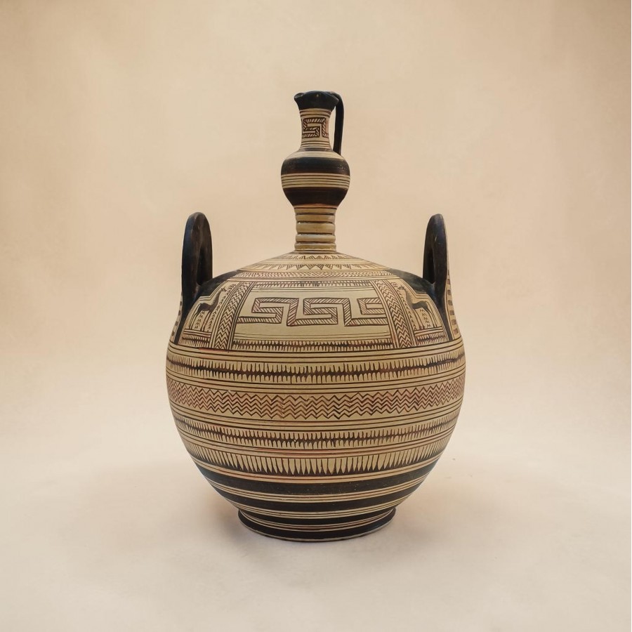 This exquisite Geometric Pyxis (jewelry box) is a faithful tribute to the 8th-century B.C. artistry. Originally used by noblewomen of ancient Athens to store jewelry and perfumes, the Pyxis is defined by its elegant lid and rhythmic decoration.
